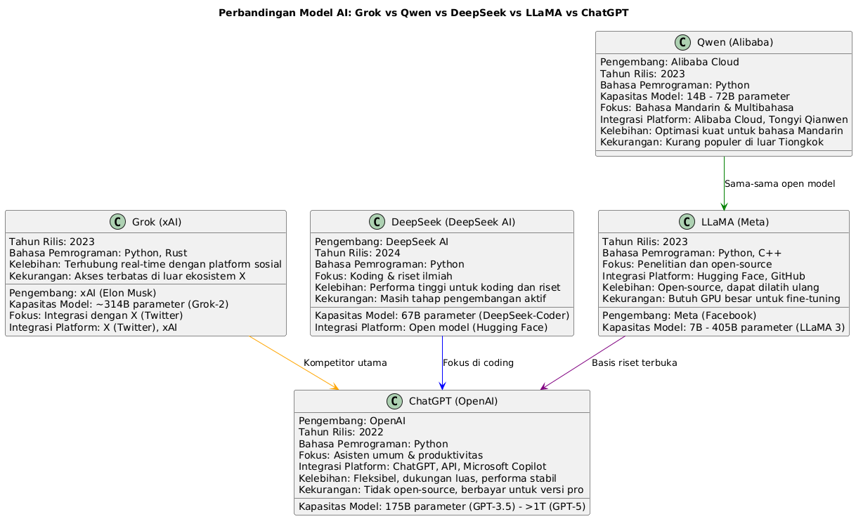Qwen (Alibaba): Dirancang kuat untuk memahami konteks bahasa Mandarin dan menjadi alternatif open model dari Asia.